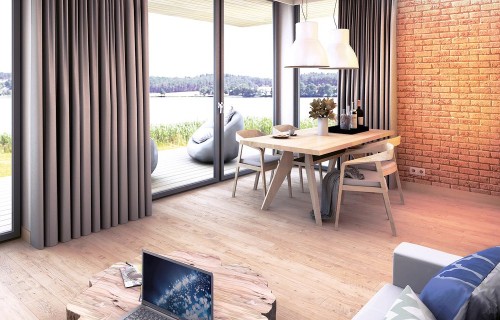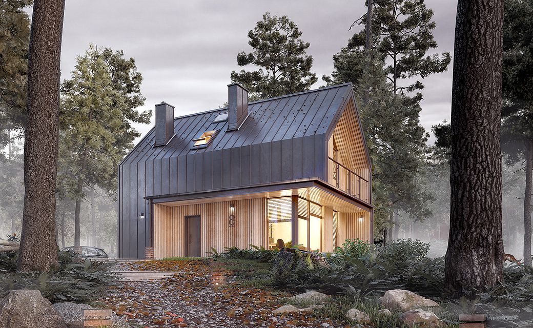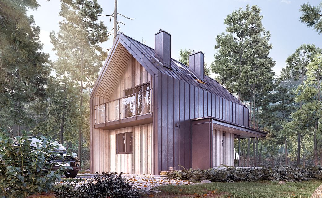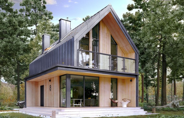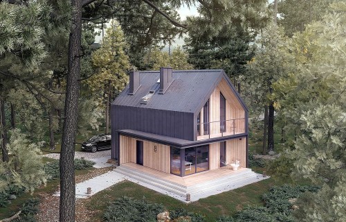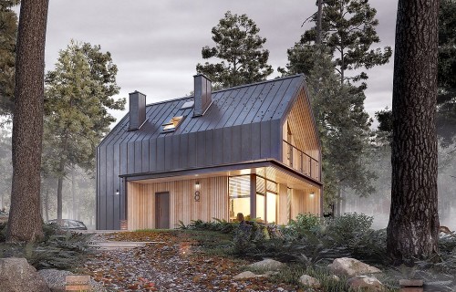 It is a tiny house design with a usable attic, characterized by a modern shape and a functional, for a small area, arrangement of rooms. The shape is simple and compact. It is finished with a standing seam sheet and large glazing in the tops of the building, which makes it look very modern. Carefully developed proportions, subdued colors and natural finishing materials make the house look attractive and minimalist.