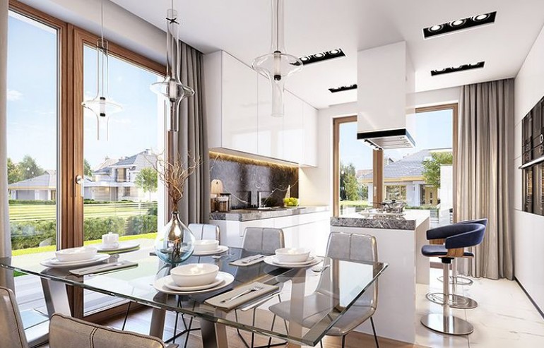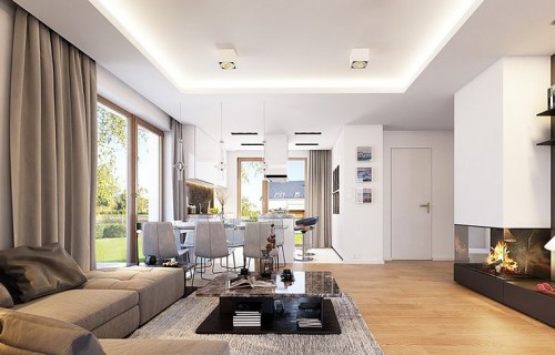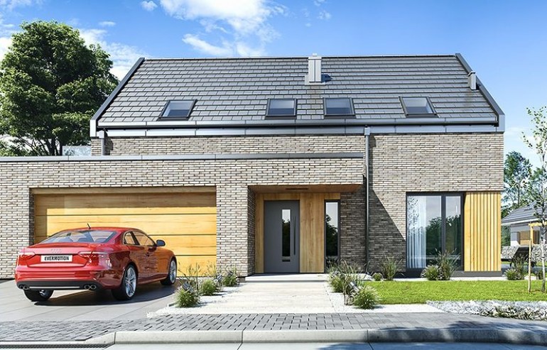 The Rumba house plan is a new version of the project belonging to the group from the series of houses derived from the "Party" project, which together form a collection of "dancing" houses, that is: Party, Party 2, Biba, Fokstrot, Salsa, Samba, Tango. The design of the Rumba house was designed on a functional plan similar to the aforementioned houses, but its style is completely different, original. The entire body of the building is finished with one material - all walls are covered with clinker tiles. Window openings widened with additional cladding made of wood create cutouts in this uniform brick block. A gable roof made of flat tiles, without eaves, completes the composition. The design of the Rumba house is modern, original and will surely stand out from dozens of similar houses - roofers. At the same time, the finishing materials used bring to mind: elegance, decent workmanship, durability and longevity of the building. This effect was achieved despite the relatively low cost of building the house. The Rumba house plan has a very simple shape and structure - it will be easy and relatively cheap to build. The interior of the house: on the ground floor there is an open living space of the combined living room, hall and kitchen. A kitchen with an island, a wall fully built-in household appliances, with a front window reaching the floor will decorate the living space. The living room with a wide fireplace and TV wall opens onto the surrounding garden and partially covered terrace with large glazing. The other rooms on the ground floor are a room (office or an additional bedroom), a bathroom with a shower and a storage compartment under the landing of the stairs, a pantry between the kitchen and the vestibule, and a double garage and a boiler room. In the attic, we have three bedrooms, including: parents' apartment with a bathroom, dressing room and own terrace, and two children's bedrooms with built-in wardrobes, separate bathroom and laundry room. In a small area of the house, it was possible to design a very comfortable interior for a family of 4-6 people. The Rumba house design is an excellent proposition for brave investors who want to stand out in a smart way. A consistently implemented project will be an attraction among the surrounding buildings and certainly no one will pass by such a gem indifferently. Welcome!