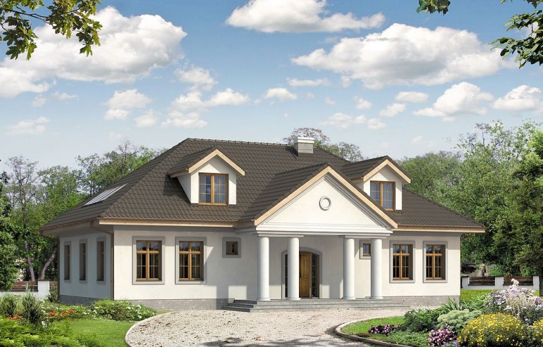 The Tercja 5 building is an alternative to the popular Tercja project. Unlike the base version, the design has more rooms, a larger area, a basement. Tercja 5 house plan suitable for a medium-wide plot. The house has a typical shape, so it will look good regardless of its surroundings. The project belongs to the category of houses with a ridge located parallel to the road, which is often specified in the spatial development plan. It is intended for free-standing buildings. It is also an excellent proposition for people looking for a house with an envelope roof, which is characterized by high resistance to adverse weather conditions. The Tercja 5 project is a one-story house with an attic, which makes its area clearly divided into zones: day and night. The building has a basement where you can arrange a laundry room and a utility room. Supporters of spacious spaces will surely be pleased with the living area provided for in the design. The author of the project provided for an open kitchen in it, which gives the interior more spaciousness. In addition, there is a place to put a table, which is conducive to shared family meals. The pantry included in the design will greatly facilitate keeping order. The design includes two comfortable bathrooms - one is on the ground floor and the other in the attic. In addition, there is an additional, separate toilet at the bottom. The seven bedrooms included in the house are the optimal option for a large family. The space can also be used as a guest room or office. Certainly, every lady of the house will appreciate the advantages of the wardrobe provided for in the design. The terrace is an ideal place to organize family meetings and moments of relaxation. The project was made in brick technology, thanks to which the house remains pleasantly cool in hot weather. Its shape features solutions referring to the manor house style and will perfectly fit into the rural landscape.