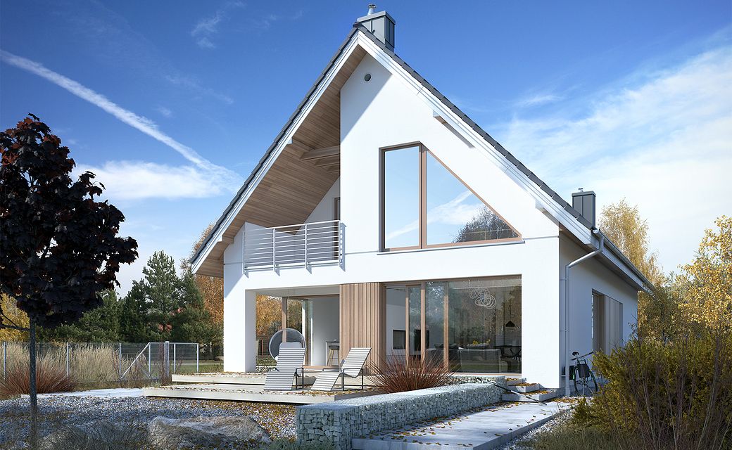 The house design of Available 6 is a perfect combination of a modern look with a fully functional interior. The house has a simple shape, which directly affects the smooth workflow. It is intended for investors who have a plot of land that allows for the implementation of a free-standing project. The building is topped with a gable roof, so its implementation does not take much time. The project belongs to the category of houses with a ridge located parallel to the road, which is often defined in development conditions. The project provides for a single garage in the body of the building, with a passage from the residential part through a practical wardrobe. Available 6 is a one-story house with an attic, which means that the day and night zones are clearly separated from each other. The living area provided for in the design will surely satisfy those who prefer spacious interiors. This zone of the house includes large glazing and an open space above the living room, thanks to which the interior looks modern and very effective. Additionally, the living room has been combined with the dining room - such a solution fits perfectly into the current arrangement trends. The kitchen is open yet slightly separated from the rest of the rooms. Thus, cooking enthusiasts can easily pursue their hobbies, and at the same time freely talk to other household members. People working at home will appreciate the fact that there is a study and a bathroom on the ground floor. An additional room is also a perfect solution if you need to spend the night. There are three spacious bedrooms in the attic. From one of them there is an entrance to an impressive loggia. On this floor there is also a bathroom, a laundry and drying room and a mezzanine - an ideal place to rest with a book. Family gatherings on sunny days will be made more pleasant by the terrace next to the house. The project was made in brick technology, thanks to which the house remains pleasantly cool in hot weather. The Available 6 project is characterized by a minimalist body with large glazing, making it an ideal choice for supporters of a modern style.