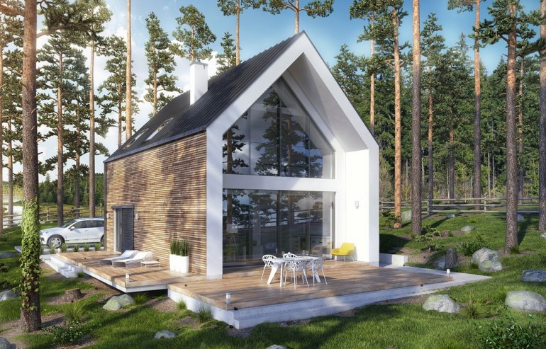 A design of a modern home, perfectly in line with the trends, original and extraordinary. This is Vikka, a unique Scandinavian-style house, an impressive modern barn, perfect for a family that values functionality and design. Large glazing guarantees a great view of the space surrounding the house and natural light in the rooms. Vikka is a project for people who want a practical and beautiful home, who like economy in form, modern design, elegance, a combination of natural materials and colors. The house consists of the ground floor and the attic, as well as a small balcony and a large terrace. The total area is 87.5 square meters, of which 56.5 is the ground floor and 31.2 is the first floor. On the ground floor there is a large living room with a kitchen, a room that can act as a study or an additional bedroom, bathroom, boiler room and pantry. Entering the first floor, we see a mezzanine overlooking the living room and the terrace behind its windows, and two bedrooms and a bathroom. What distinguishes the Vikka project is certainly a perfectly lit, glazed living room, a room on the ground floor, two comfortable bathrooms, wood on the facade and a mezzanine above the living room, which give the character of a modern shape. Vikka is a house design that will meet the expectations of a 2 + 1 or 2 + 2 family. Three closed bedrooms, as well as a large living room, where most of your free time is spent, will make everyone feel at ease. The division into day zones on the ground floor and night zones on the first floor allows you to maintain peace and balance when you need it. The impressive terrace surrounding Vikka is an extension of the living room and will be a perfect place to meet friends or rest.
