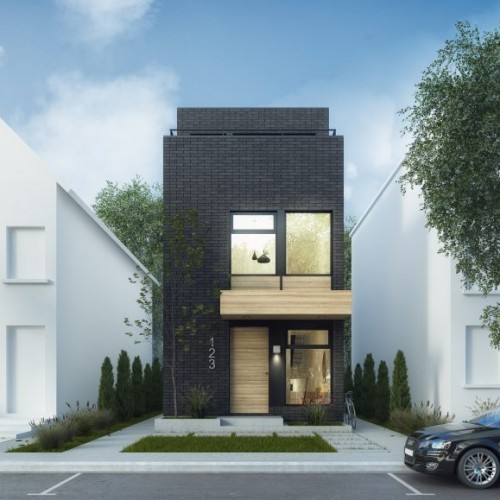 This inspiration is a split-level concept featuring a triple-height space with skylights above the central staircase. The master bedroom has higher ceilings, while the kitchen and dining area are in a semi-basement with a patio door that leads to the exterior sunken backyard.