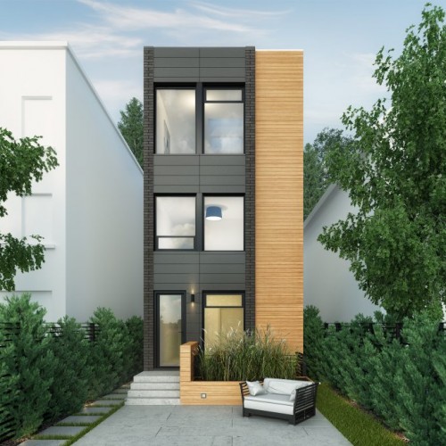 The standout feature of this inspirationis a reversal of the traditional story configuration, with the bedrooms in the basement and ground floor, and the kitchen, dining room and office situated on the top floor. The first floor has a double-height master bedroom with a curtain glass wall looking out onto the street.