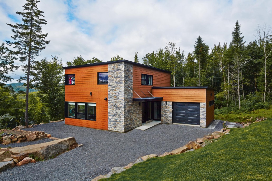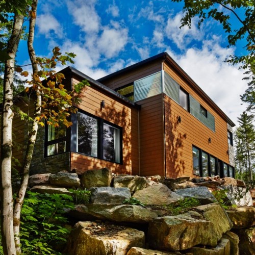 This beautifully proportioned small house in the country is surrounded by trees and sits on a steep terrain. The owners, a couple with teenaged children, use it as a cottage getaway. The ample fenestration covering most of the exterior facades gives the impression that they are truly living in the forest, with daylight streaming in all day long. Inside, both floors have high ceilings and there’s a large living room where the family can relax in peace. Straightforward design and an adjoining garage make this a real home away from home.