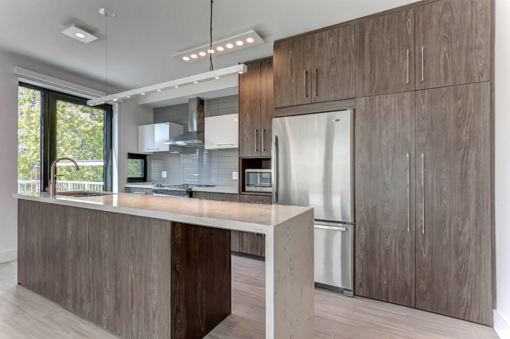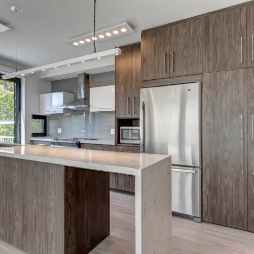 Located on a very narrow lot, this JNCN HOMES custom designed multi-residential building takes full advantage of all the natural light and environment. The 20’ wide building will have three residential units of 924 sq.ft. each on 3 levels and a fourth unit of 898 sq.ft. in the basement. All units have two bedrooms, a bathroom and an open-concept kitchen with living room highlighted by floor to ceiling windows.