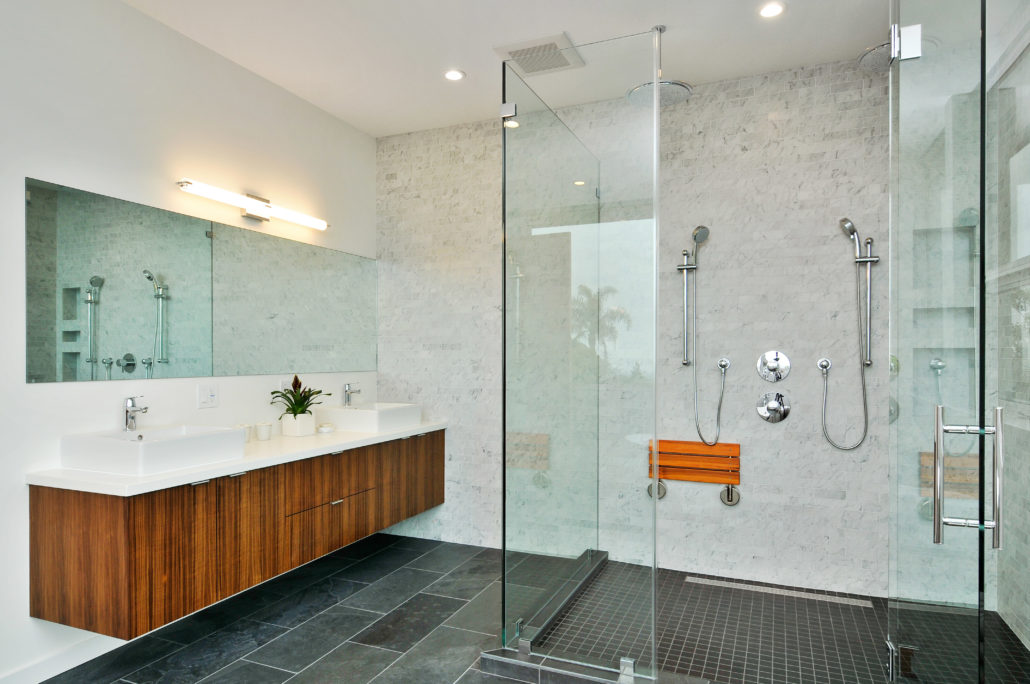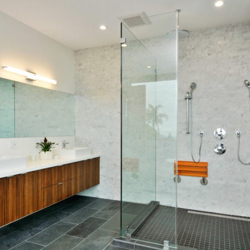 Four and a half baths with custom walnut vanities.